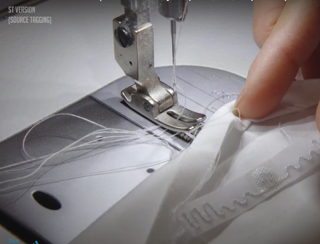 タグをパウチやヘム(折り返し)に挿入して、両端をミシン掛けで固定できます。アイロンで布地に熱圧着することもできます。