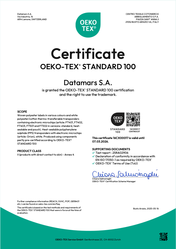 FT401、FT403タグは繊維製品の安全性を保証するエコテックスⓇ認証を受けています。